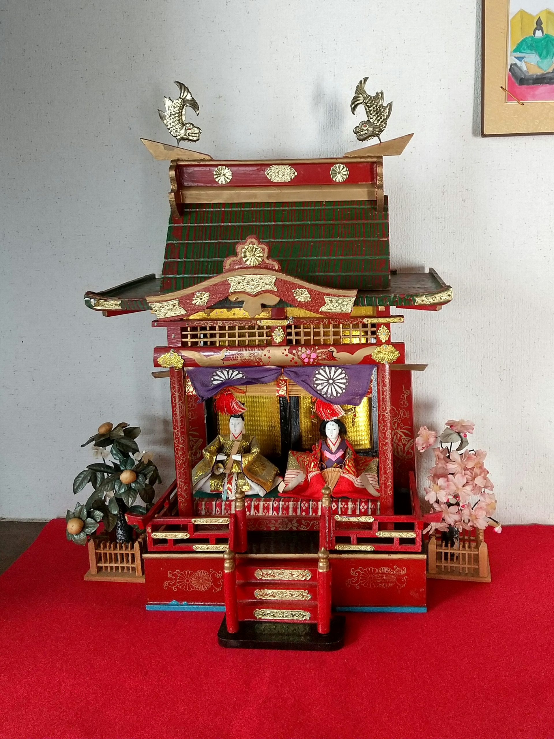 江戸時代後期には江戸を中心に「段飾り」が発展し、一方、上方では「御殿飾り」が優勢だったようです。御殿飾りは戦後には広く西日本一帯で流行したようです。妻の出身の出雲地方でも流行していたのですね。東海地区では金の鯱がのったきらびやかなものがはやったとあります。妻の御殿飾りにも、出雲地方にもかかわらず、なぜか鯱がのっています。さて、この御殿飾りですが昭和 30 年代後半には姿を消します。「百貨店や人形店などが頒布する一式揃えの段飾り雛に押された」とあります。ひと揃いの段飾りを販売する方がいい商売になったのでしょう。その代わり、地方の文化が失われてしまったのです。妻の雛人形は姿を消す直前、最後の時代の「御殿飾り」なのです。