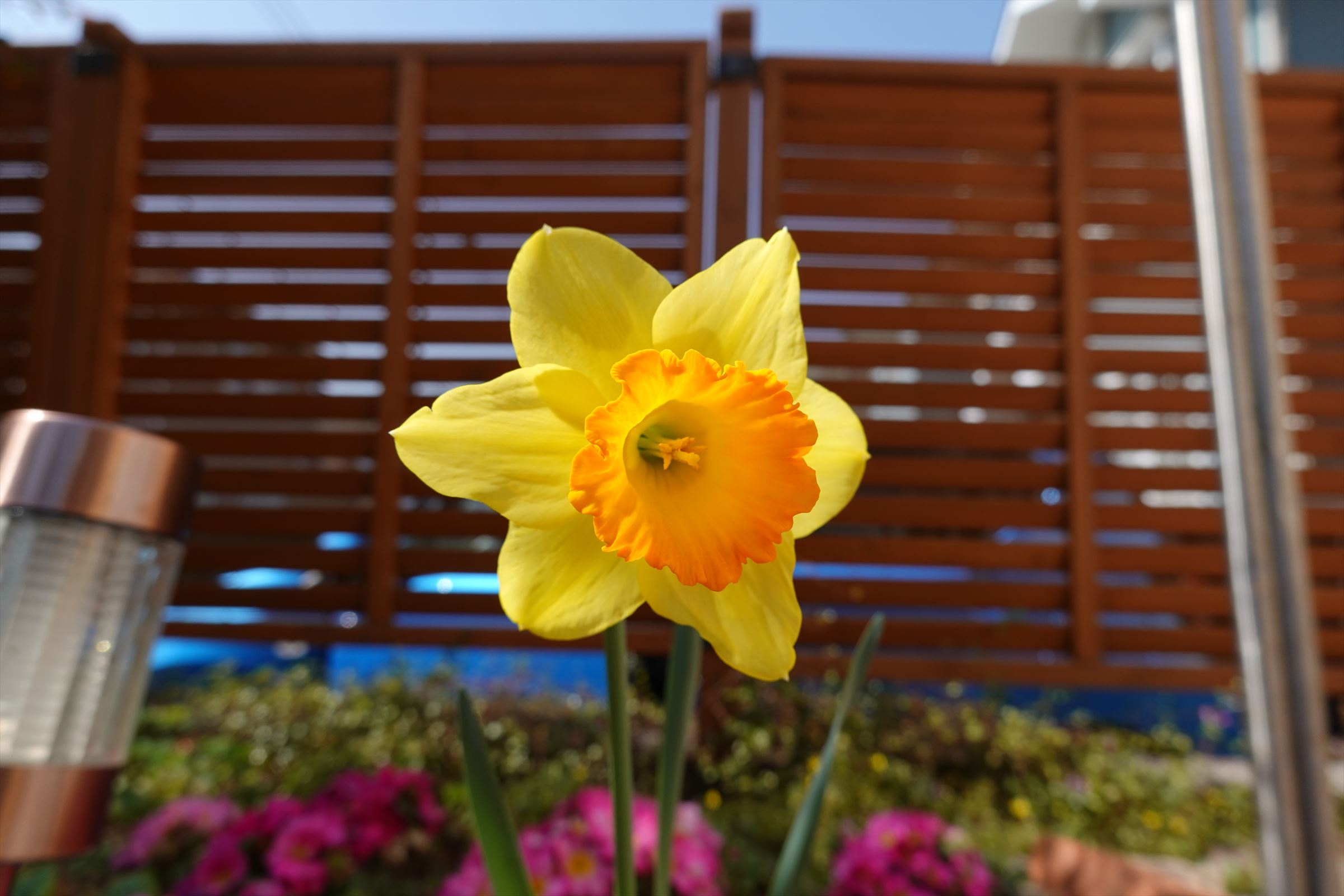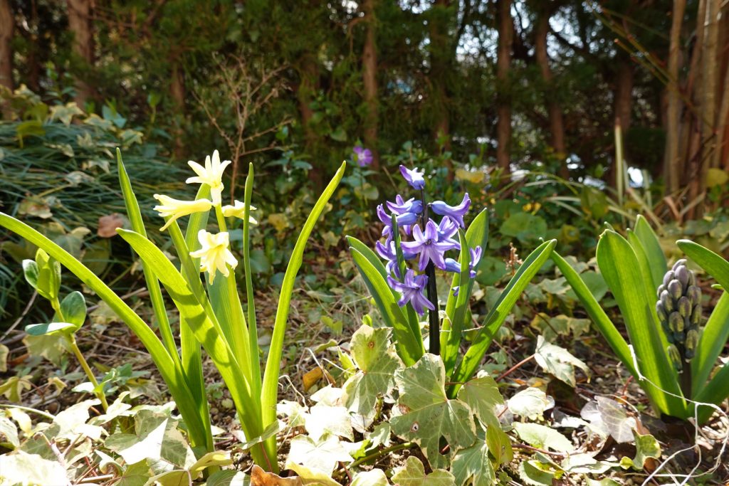 暖かくなって急に庭の花が咲き始めました。何も世話をしていないのに、毎年この季節になると水仙やラッパ水仙が花をつけます。ヒヤシンスは妻が水栽培の後、庭に球根を植えたもの。球根がふくらんで、春になるときれいに咲くようになりました。