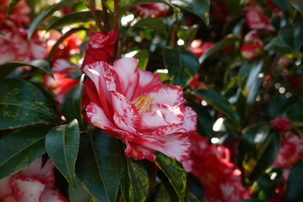 おしまいの写真は昨日、散歩の途中で見つけた椿です。紅白のまだらで「紅白絞りの椿」という品種です。珍しい ? ので写真を撮りました。「椿」は「木へん」に「春」と書きます。いかにも「春」の花ですね。