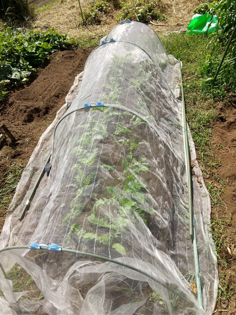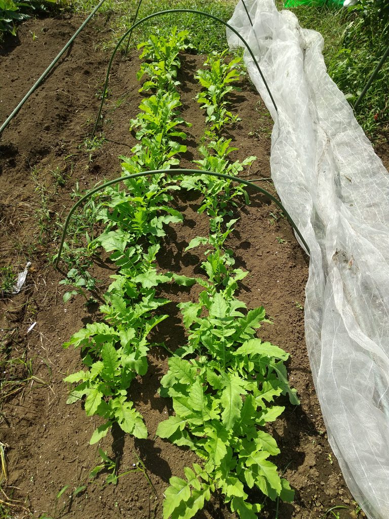これが今日の大根である。9月の初め、北海道から帰ってから蒔いたもので、一度、土寄せし、一部虫害で芽が食われていたところを蒔きなおしたものだ。間引いて株間が 10 cm 程度になるようにした。間引き菜は今夜、お浸しにする。再び、防虫ネットをするが、バッタがいるのを発見。これを入れたままでネットを張ったら中は虫の天国だと、あわてて追い払う。