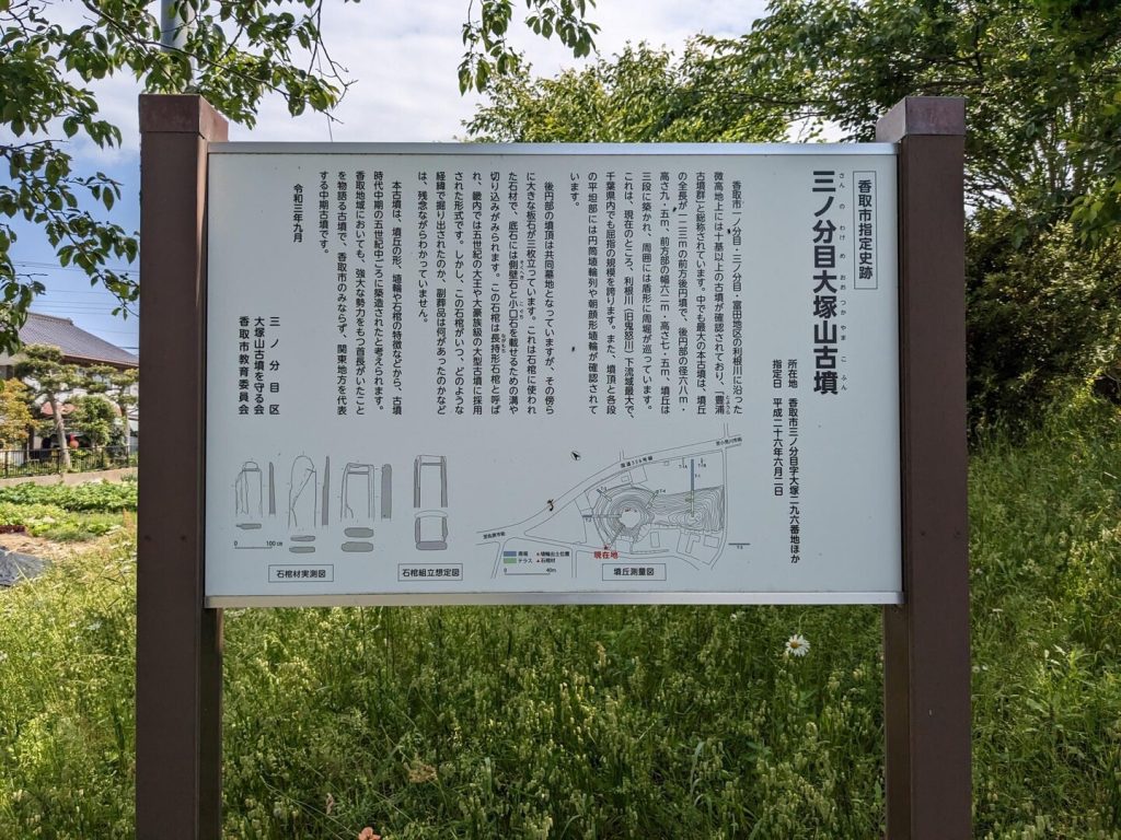 国道を避け、一本南側の道を歩いた。ここでも古墳に遭遇した。「三ノ分目大塚古墳」である。説明板があり、その横の階段を上がると古墳の上に出た。この古墳の位置は珍しい。「三ノ分目」とは新田開発における区画だから、香取海の中の沖積層だったことを表している。中期の古墳なので海の中だったのではないか? あるいは、ここだけ島になっていたのか? 有力な豪族の墓だと思われるが、被葬者は不明との事である。