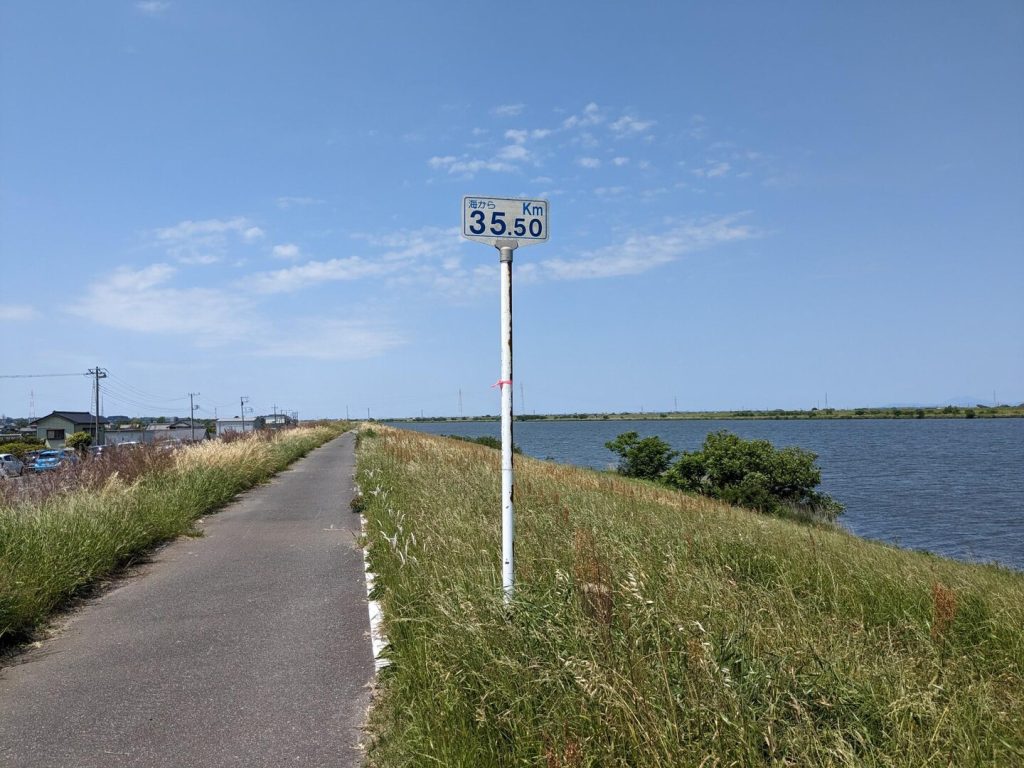 利根川土手の自転車道に出た。自転車や歩行者はほとんどいない。暑い中ここを歩くのはたいへんだ。前回同様、海からの距離が表示されている。ここで 35.5 km 。右手には「JR 鹿島線」の「利根川橋梁」が見える。