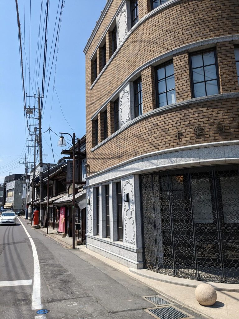 小野川に沿って北へと歩く。写真は「忠敬橋」北側の「千葉商船のビル」、その奥に書店④や呉服店⑤が並んでいる。