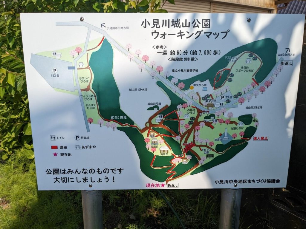 急に周囲の見通しが良くなり、右手にはマクドナルドが出現。ここで国道を左折し、「小見川城山公園」を目指す。成田線を越えて右折するとすぐ公園の入り口に出る。地図があった。ここには千葉氏の一族、粟飯原氏の居城だった「小見川城」の跡がある。また、多数の古墳が存在しているところでもある。まず、目の前の小山に上ってみよう。