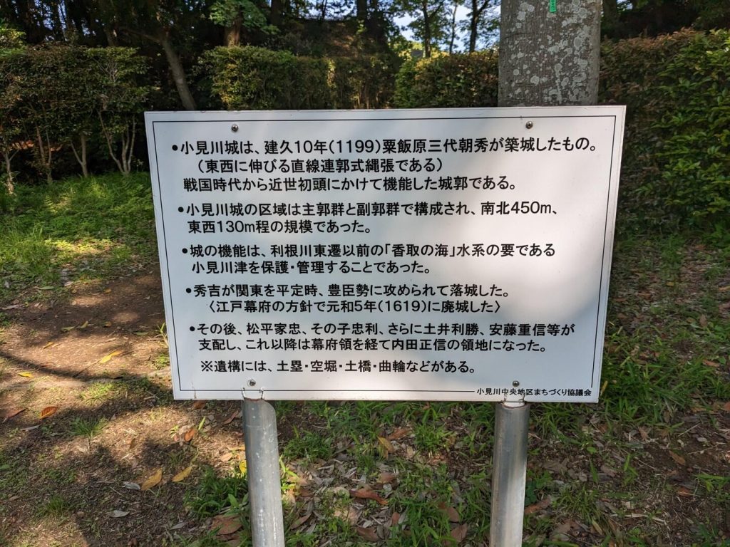 山を下り、「小見川城跡」へと移動する。途中「城山 1 号古墳」の横を通ったのだが、まったくそれと気づかなかった。本丸跡は写真の通りで、礎石が残っているのみである。説明板があった。「小見川の津」とあるように、「小見川」は水の都で船が多数出入りしていたようだ。その後、「松平家忠」がこの地に移封され「小見川藩」が作られる。江戸時代に入ると「利根川東遷」があり、「小見川」は河岸として繁栄をとげた。