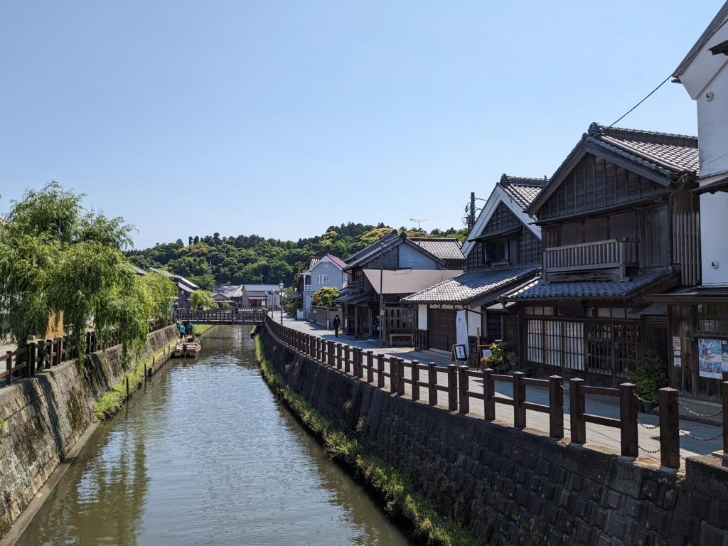 道を進むと「小野川」に出る。「忠敬橋(ただたかばし)」がかかっている。橋の南側左手に「伊能忠敬旧宅⑧」、右手に「伊能忠敬記念館」があるので、このあたり伊能忠敬一色だ。江戸情緒があっていい風情である。奥の橋(樋橋⑩)の手前にある桟橋から「小江戸さわら舟めぐり」の舟が出ている。「伊能忠敬記念館」には、彼の 50 歳までの前半生と隠居してから 71 歳まで実施した全国測量の行程や測量機器、そして 1821 年に完成した「大日本沿海輿地全図」が展示してある。現在の地図との重ね合わせたパネルがあったが、北海道で位置のずれが少しあるものの、その正確さにはビックリする。「家業を十分になし終えた後の第二の人生でこれだけのことができるのだ」と、勇気づけられる展示だった。