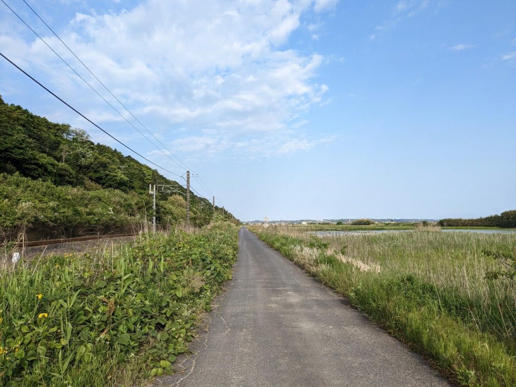 次第に車の量が増えてくる。歩道がないので快適なウォーキングにはほど遠い。狭い国道を歩くのはヒヤヒヤものだ。トラックが来ると身の危険を感じる。ちゃんとした歩道をつけてもらいところだが、国道は旧街道を通っていることが多く、なかなか拡幅できないのだろう。町境に脇道があったのでそちらに移る。成田線と並行する小道があった。車に気をつかう心配がないので歩きやすい。国道はというと台地の上を走っているようだ。