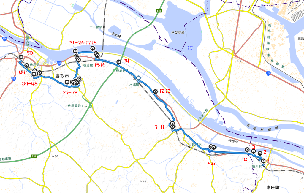 再び国道歩きを始める。まず「東関東自動車道」、続いて「JR 鹿島線」の下をくぐった。「鹿島線」は「香取駅」で「成田線」から分かれ、「十二橋駅」「潮来駅」「鹿島神宮駅」を経由し「鹿島サッカースタジアム駅」を終点としている。