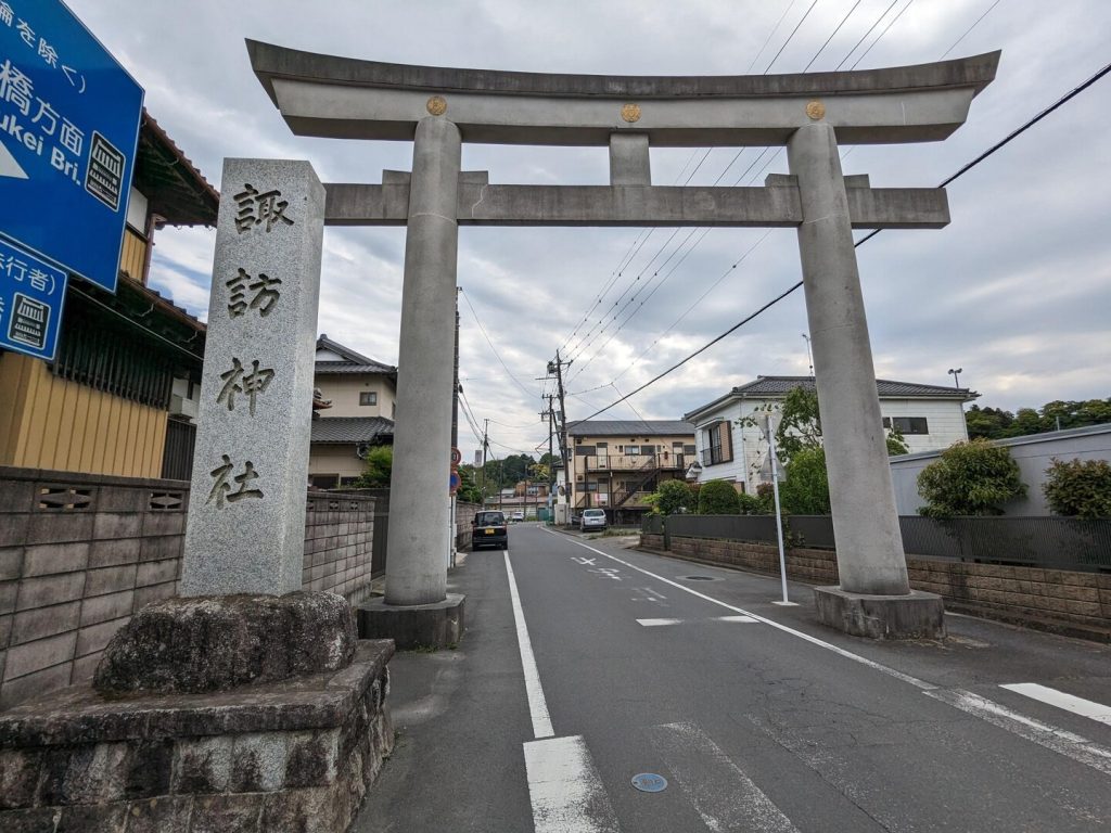 北側にある「共栄橋」から「中橋」を臨む風景である。この川の両側の道を祭りの時には山車が通るのである。これはなかなか見物だろう。さて、そろそろホテルへ向かおうと「忠敬橋」まで戻り右折する。途中、「諏訪神社」の鳥居の前を通った。