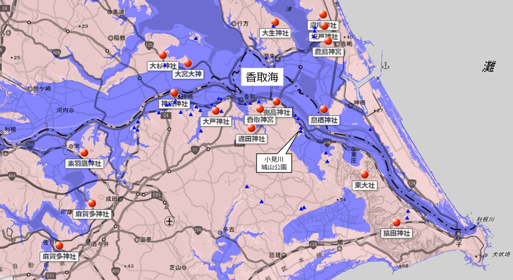 前回、「香取海」の話をした。古代は気温が高く、海面が現在より上昇していた。このため、標高の低い場所は水没し、「香取海」という広大な海が広がっていた。図は現在の地図で、標高 5 m 以下を海とした場合の状況である。三角は古墳、赤丸は神社だが、これらは海に面した台地の上にあることがわかる。「小見川」の町の大部分は「香取海」の中にある。この辺りは大きな湾になっていたのだ。その西側の岬に当たる部分がこれから行く「小見川城山公園」である。