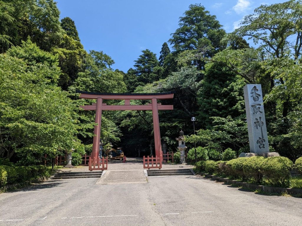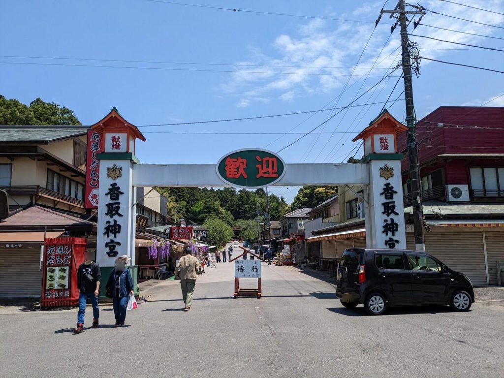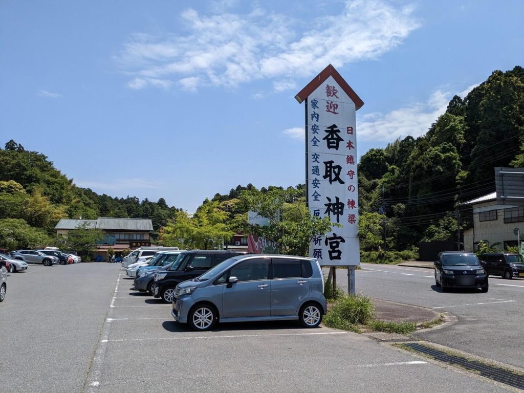 11:35 ようやく駐車場に到着。そこそこ車が停まっている。参道の両側には店が立ち並んでいるが、平日なので閉めている方が多い。食事は後に回して先に進む。参道商店街を抜けると「朱塗りの大鳥居」の前に出る。「香取神宮」と書かれた立派な石碑がある。ここは下総国一宮であり、神社ではなく「神宮」なのである。「神社本庁」のホームページよれば、「神宮」の社号を付されている神社には、皇祖をお祀りしている霧島神宮や鹿児島神宮、また天皇をお祀りしている平安神宮や明治神宮などがあり、このほか、石上神宮や鹿島神宮・香取神宮など特定の神社に限られているとのことである。さきほどの「香取海」の地図にあるように、「鹿島神宮」と海を隔てて向かい合っている。