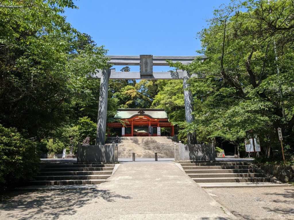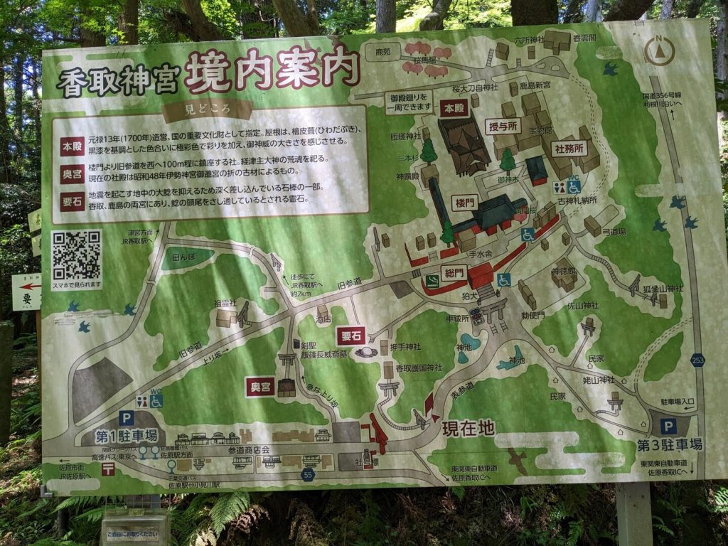 大鳥居をくぐると境内の案内図があった。参道を進むと「総門」「楼門」があり、その先に「本殿」があるとのこと。そこから西に進むと「要石」「奥宮」に出られるようだ。まずは参道を「本殿」に向けて進もう。