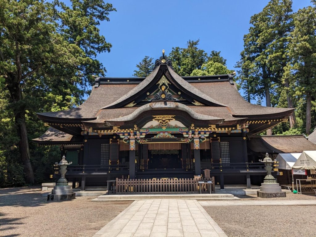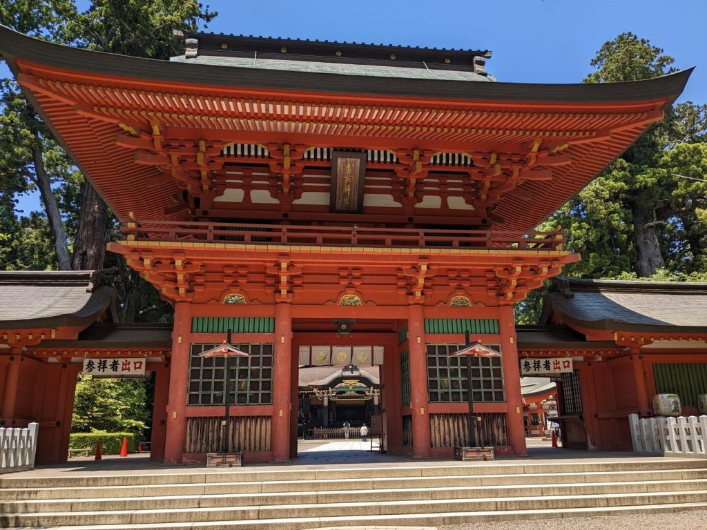 「総門」の先に「楼門」があるのだが、一直線上に並ぶのではなく、センターをちょっと外してある。「楼門」を見る。これは見事な建物だ。元禄 13 年(1700 年)に徳川幕府が造営したものだそうだ。屋根は現在は入母屋造銅板葺だが、当初は「とち葺」だったとのこと。この先に本殿がある。