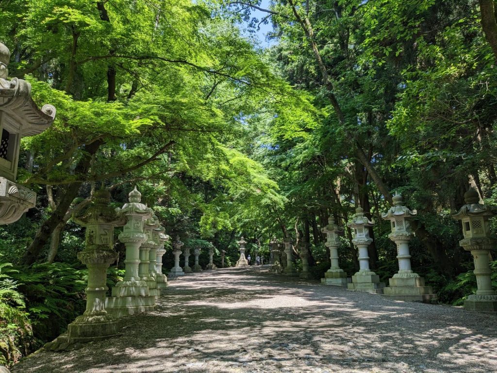 木立に囲まれた参道は両側に燈籠が並んでいる。道幅は思ったほど広くない。大きな石の鳥居があり、その先に朱塗りの門がある。あれが「総門」だろう。
