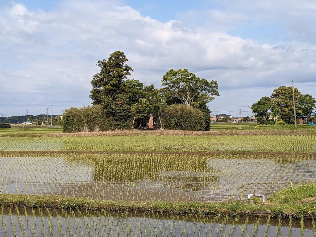 進行方向、田圃の向こうに突き出た緑の丘が見える。あれが「神崎(こうざき)」だろう。