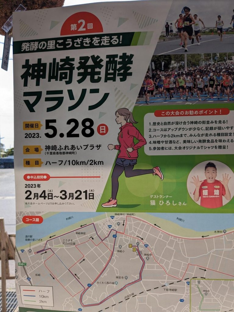 「神崎」は直ぐそばに田圃があり、美味しいお米がとれるし、湿潤な気候なのでお酒造りに向いている。近くの道の駅を「発酵の里こうざき」と名づけるほど、「発酵」をキーワードに町おこしをしようとしているようだ。「神崎発酵マラソン」のポスターを見つけた。なんとマラソンイベントの冠にも「発酵」を使っている。