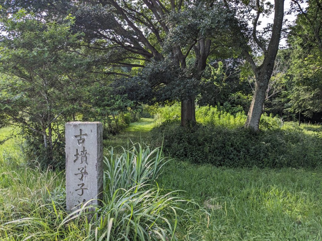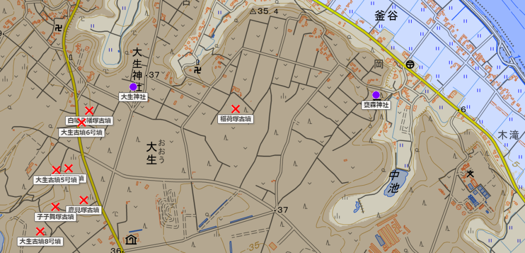 図 8-1 の塗りつぶしの赤丸は前方後円墳、白抜き赤丸はそれ以外の古墳である。「大生神社」の周辺には「大生古墳群」がある。この地図のデータは「奈良文化研究所」の「文化財総覧WebGIS」を元にしていて、「大生古墳群」は方墳等と記載され、前方後円墳の記載はみられないが、実際には「大生神社」を中心に「西部古墳群」「東部古墳群」「釜谷古墳群」に分れて、合計 120 余基の古墳が存在し、西部古墳群には「 鹿見塚古墳」「子子(まご!)舞塚古墳」など 4 基の前方後円墳と小型の円墳群、東部古墳群にも前方後円墳「稲荷塚古墳」がある(図 8-2)。