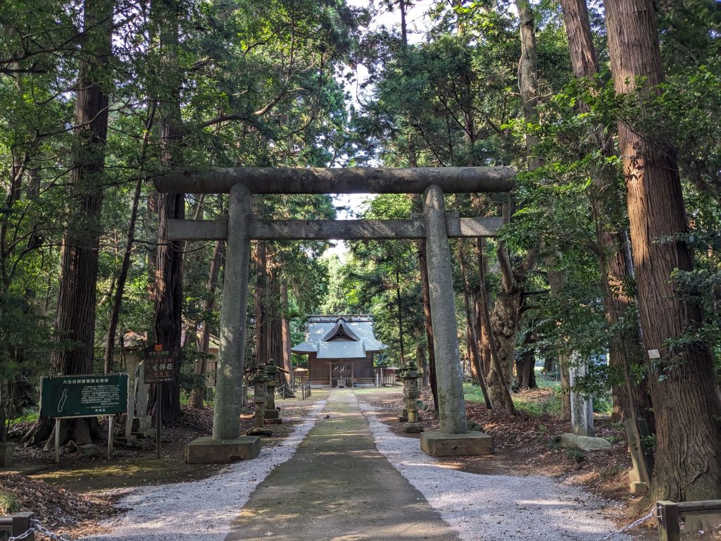 大型の前方後円墳である「鹿見塚古墳」を過ぎると県道 187 号線に出る。ここを右折すると左側に「大生神社」の「一の鳥居」があり、そこから林の中の参道を進むと「二の鳥居」の前に出る。古木の林の中に荘厳な社が佇んでいる。