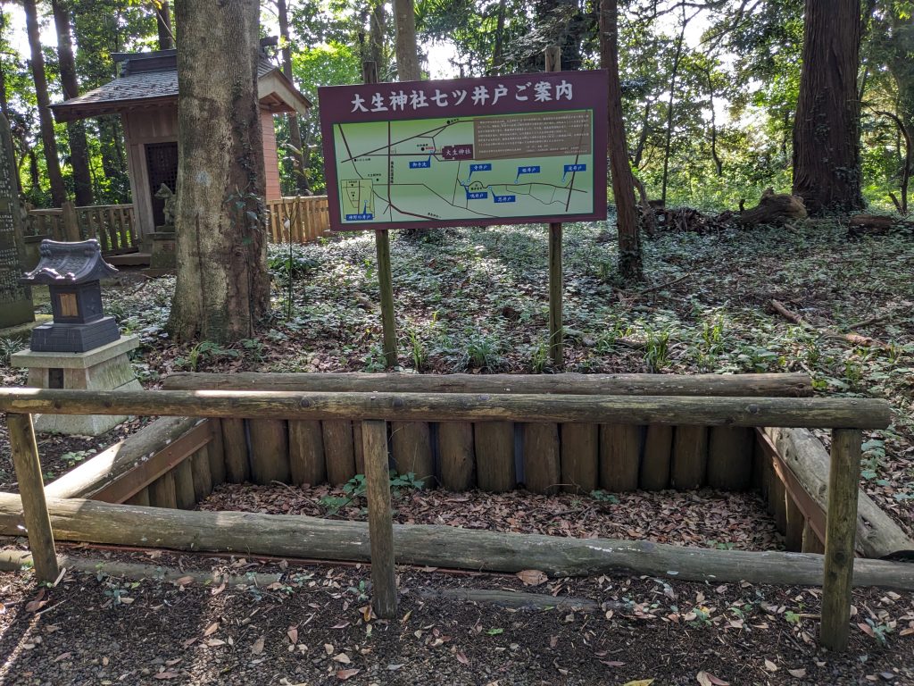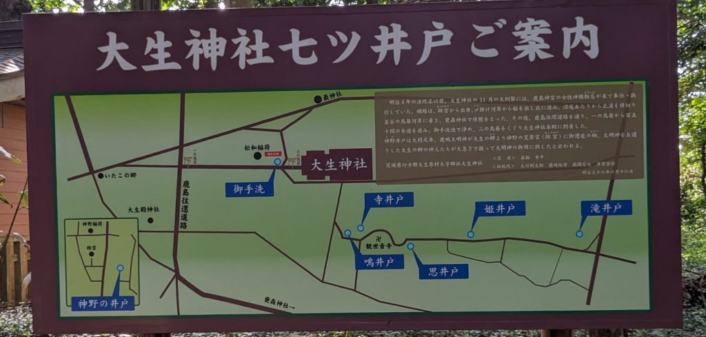 話は戻るが、「二の鳥居」の手前に「大生神社七つ井戸ご案内」の説明板が立っている。その前の井戸が「御手洗」であるらしい。「七ツ井戸」とあるから、他に六つ井戸が近隣にあるのだろう。「ご案内」は周辺の地図で五つの井戸が示されていて、「神野の井戸」だけは別書きなので離れたところにあるようだ。