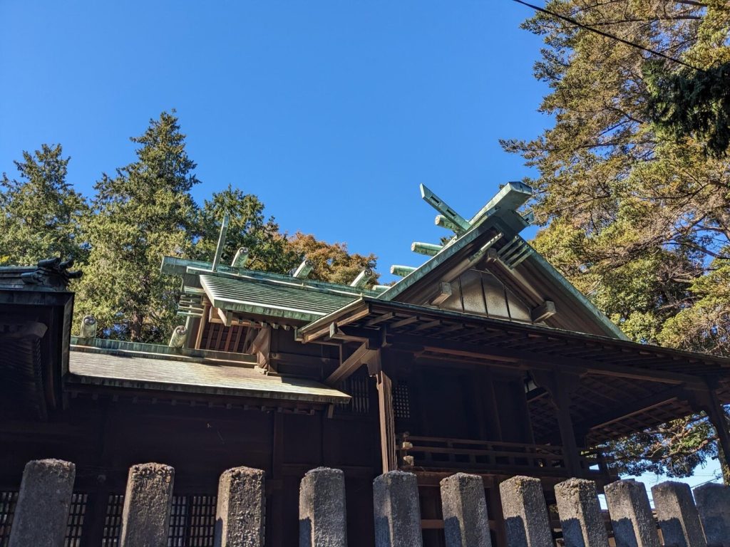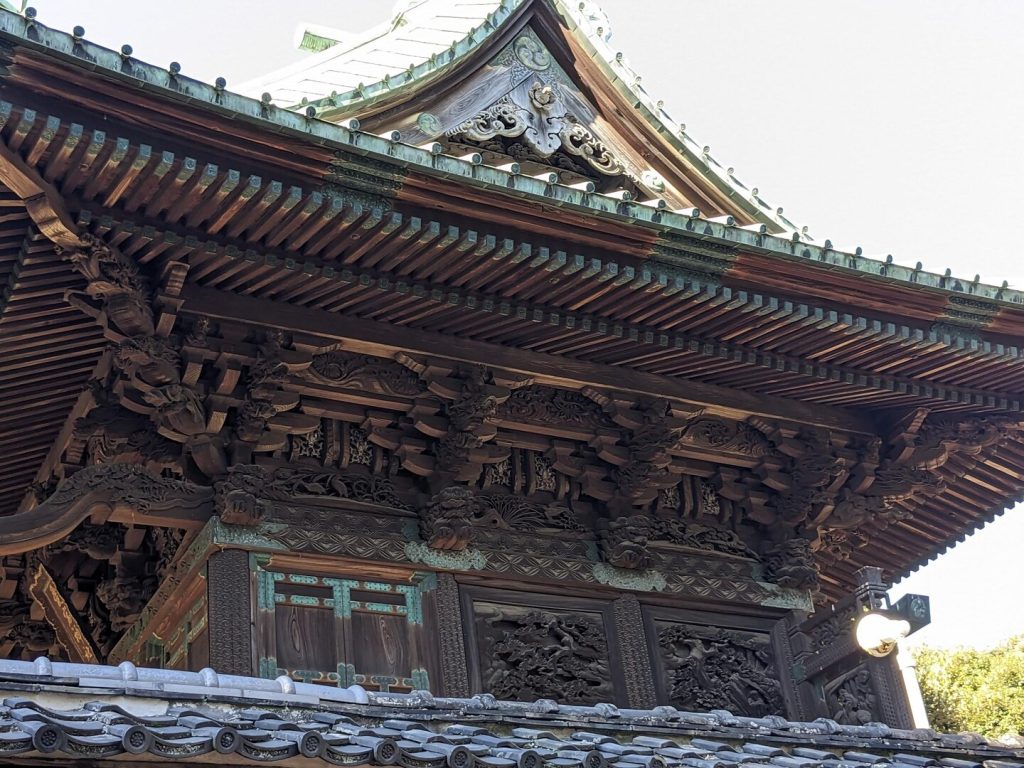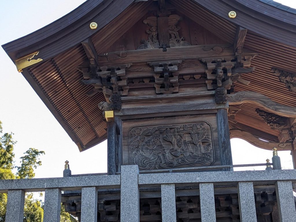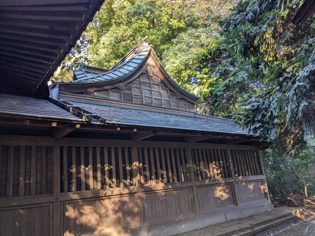 本殿は文政七年(1824)から 11 年をかけて再建されたという立派なもので、入母屋造りの三間社、正面千鳥破風付き、軒唐破風付き、向背一間、銅瓦葺きで、壁と柱に精巧な彫刻が浮かし彫りされている。