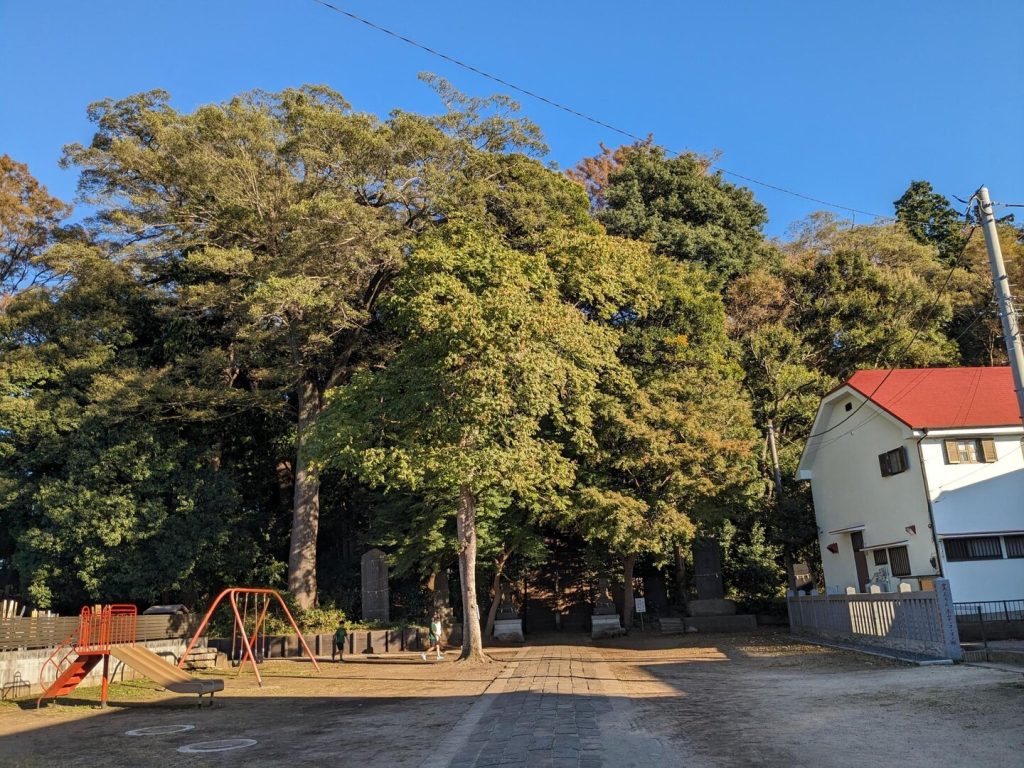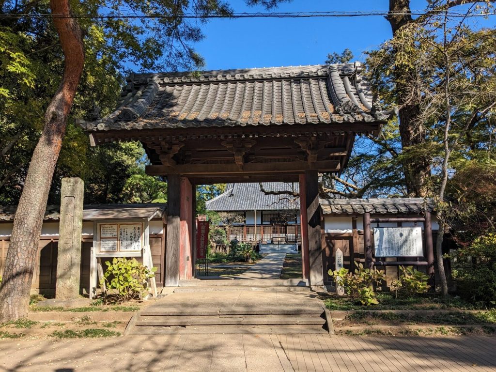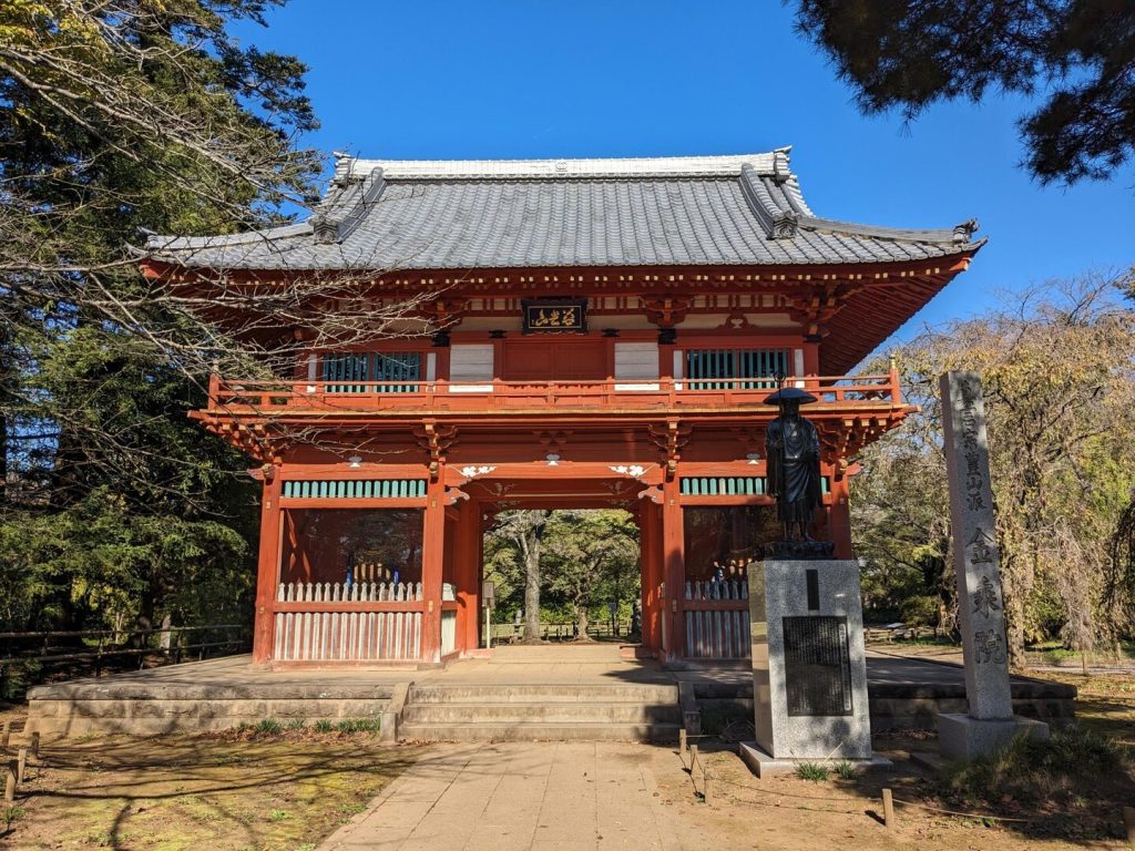 園内には元?の地主である「慈光山金乘院」がある。このお寺は室町幕府の足利義持の時代、応永5年(1398)に京都・醍醐寺の修行僧によって開山されたが、その後、真言宗豊山派に宗派が移っている。参道の入り口に「仁王門」が建っていて、その前には「空海」の像もある。あざやかな朱塗りで、300 年前に建立されたものを平成 10 年に全面修復し、ニカワの丹塗りを再現したそうである。