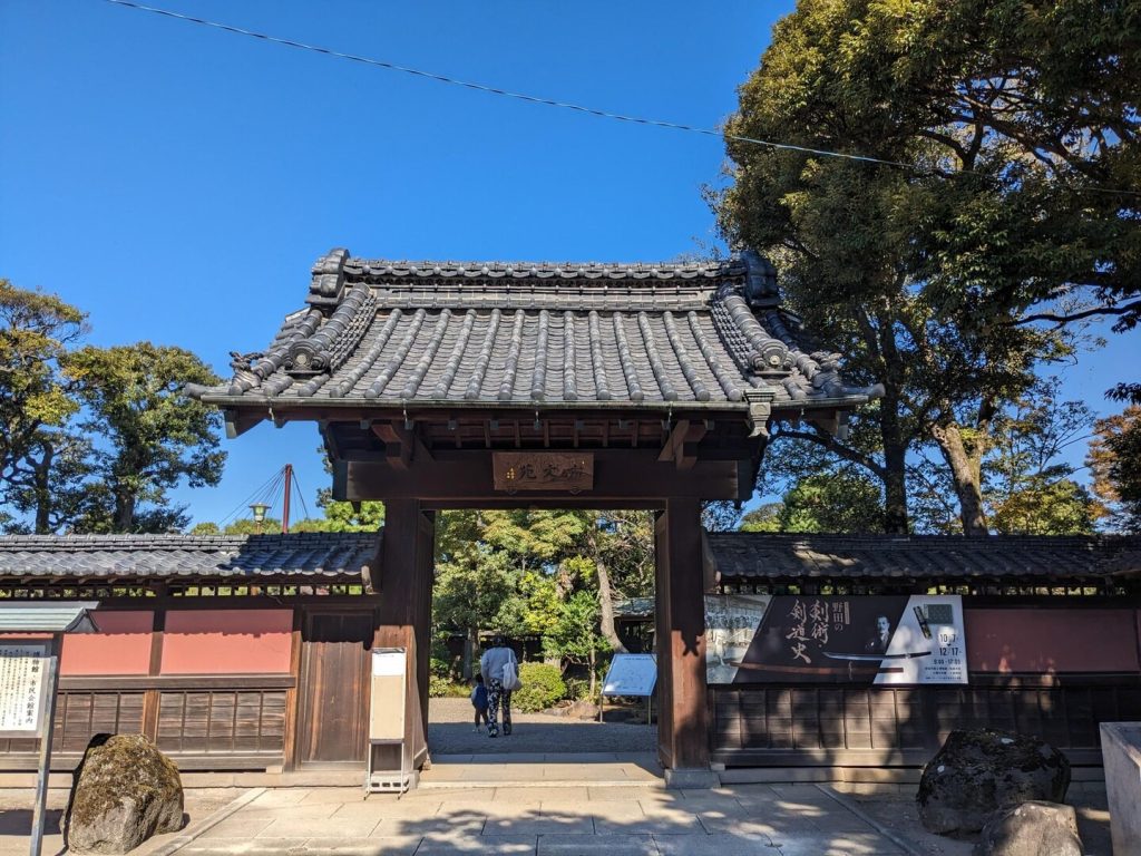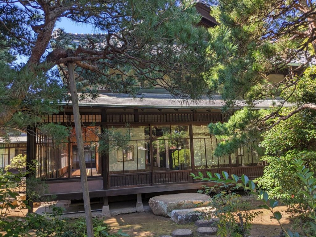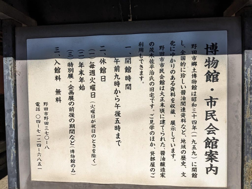 説明がなければ、これが市民会館とは誰も思わないだろう。まさに邸宅の入り口である。玄関に靴が数足脱ぎ置かれていて、利用者がいることが分かった。博物館は「野田の剣術・剣道史」という企画展が開催中で 1 階がその展示、2 階が醤油関係の常設展示になっていた。見学を終えて、「旧茂木佐平治邸」の庭を見学した。