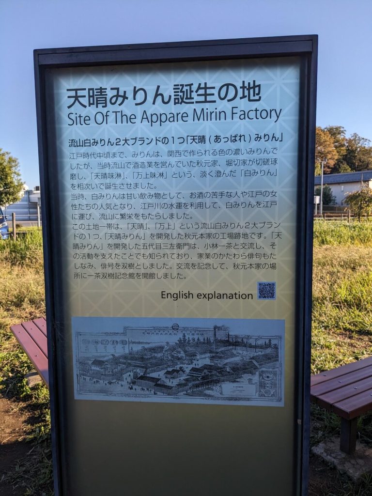 「近藤勇陣屋跡」の先を南に曲がると「万上(まんじょう)通り」に入る。「万上」とは「流山白みりん」のブランドの一つ「万上みりん」から来ており、道の左手は工場になっている。「万上みりん」は現在はキッコーマンだ。更に進むと、通りの名称が「天晴(あっぱれ)通り」に変わる。こちらはもう一つのブランド「天晴みりん」が生まれたところである。工場跡地に説明板が立っている。「流山」における「白みりん」の製造開始は諸説あるが、キッコーマンのホームページよれば、「遅くとも天保年間初頭(1830 年代初頭)までには、流山で造られたみりんが江戸・京都・大坂で評判になっていたことが明らかです」とある。なお「天晴みりん」の工場は「日光」に移転したとのことだ。