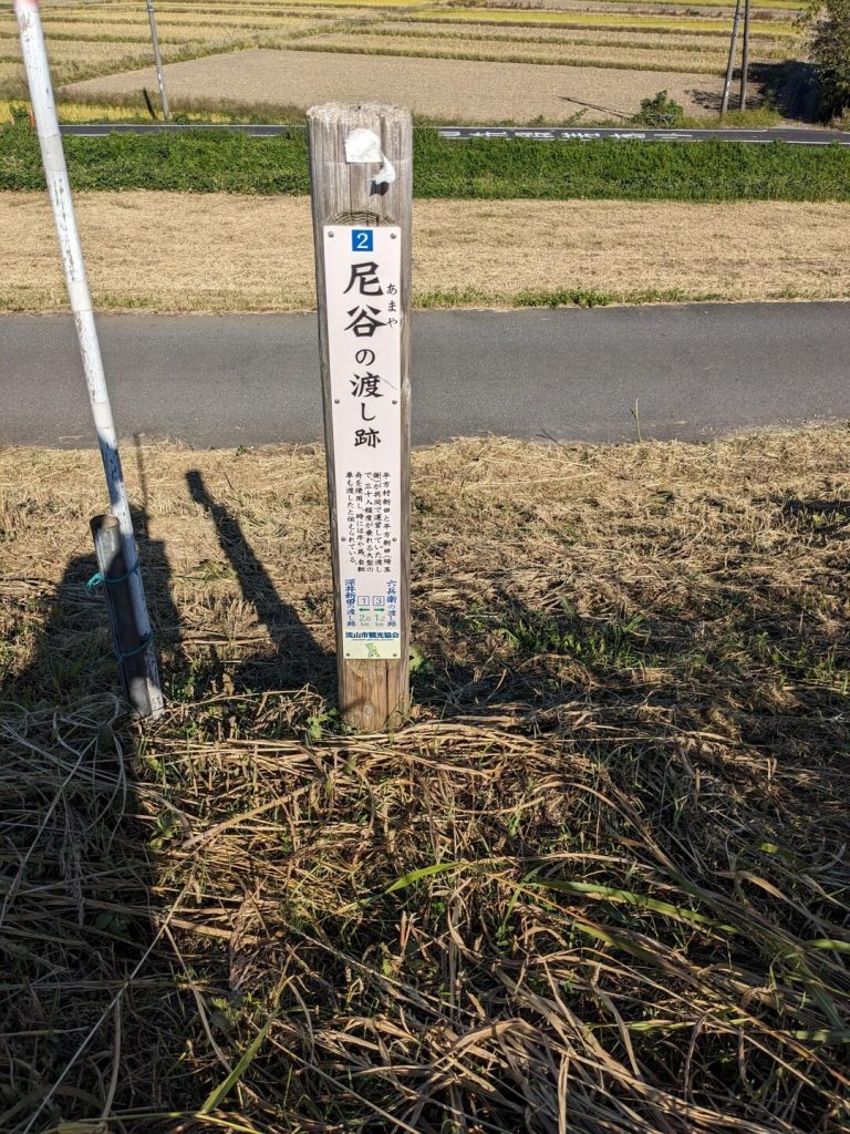「尼谷(あまや)の渡し」という標識を見つけた。昔、「流山」には 8 つの渡し場があった。江戸の防衛の為、「江戸川」には橋がなく、対岸には船で渡った。もっとも有名なのは細川たかしの歌のタイトルになった「矢切の渡し」だ(次回訪問)。「尼谷の渡し」は北から 2 つ目の渡しで、「30 人ほどが乗れる大型の舟を使用し、時には牛や馬、自転車も渡したと伝えられている」と説明が書かれている。