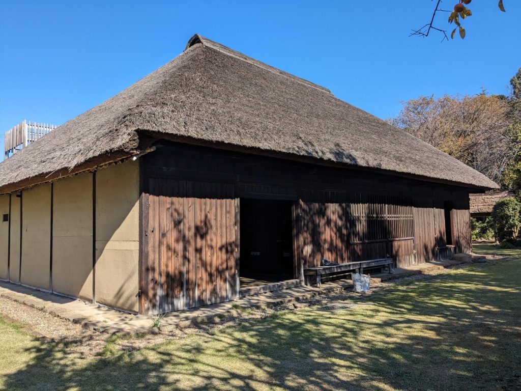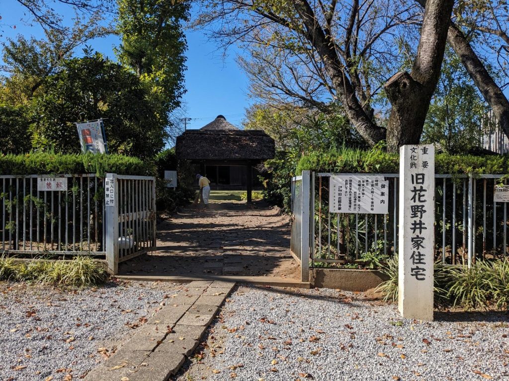 ポニー牧場とアクアベンチャーの間の道を南に進むと、「旧花野井住宅」の門が現れる。江戸時代、「流山」の「小金(こがね)」にあった幕府直轄の「牧」を管理する「牧士」を代々勤めていた「花野井家」の住宅であり、「流山市前ヶ崎」にあったものを「野田市」が寄贈を受け、建築当初の姿に復元して昭和 46 年(1971)に移築したものだそうである。北総地域の南北に連なる台地上には江戸時代、軍馬育成のための放牧場である「牧」が いくつも作られていた。そういえば、前に行った「柏」の「吉田家」も「牧士」だった。外見は茅葺き屋根のシンプルなもの。内部は典型的な民家の造りで、保存状態がとてもよい。残念ながら上に上がることはできなかった。