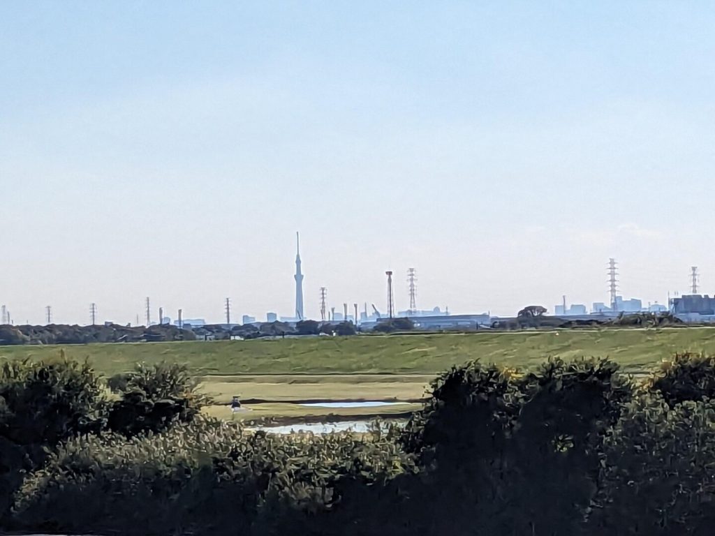 「上新宿新田」まで来た。「江戸川」の向こうに東京の町が見えている。小さいが「スカイツリー」も見えた。拡大してカメラに収める。