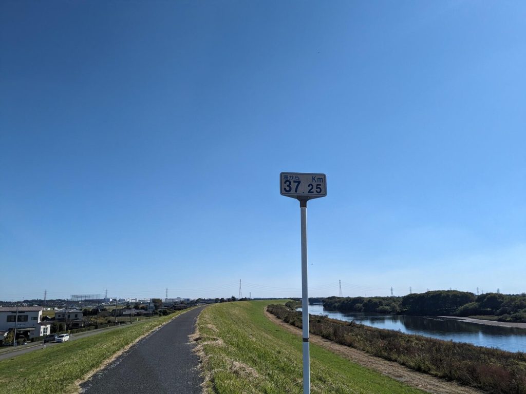 「江戸川」土手の自転車道に上る。海から距離 37.25 km という表示が出ている。「関宿」の「江戸川」流頭付近で 59.5 km だったから、 22 km 下ったことになる。この道をこれから「流山」まで歩くのである。「関宿」までの「利根川」の自転車道はロードバイクばかりで、普通の自転車は走っておらず、ましてや歩いている人を見かけなかったが、少し雰囲気が変わってきた。ロードバイクが主流であることは変わらないが、自転車の学生や散歩者も見かけるようになってきたのだ。だいぶ町が近くなってきたと実感する。