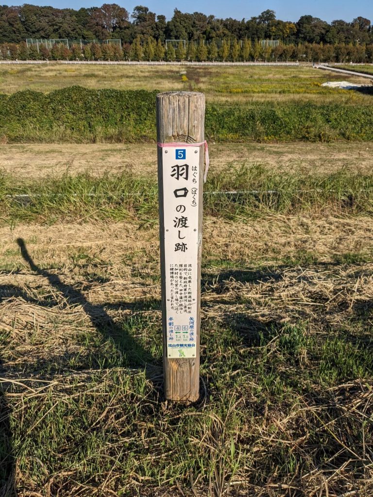 こちらは「羽口の渡し跡」の標識。「丹後の渡し」のひとつ北にある渡しである。「流山に屯集した新選組を制圧するため、新政府軍が来流し、砲列を敷いた。田中藩が統治した加村の公営の渡し場だが、近くに賭博場があったとも言われる」と書かれている。だから、「はぐち(ばくち)の渡し」というのだろうか。