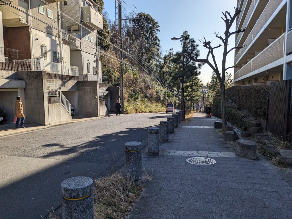 この先で通りを横断し正面の細い道に行くところ、私は道を間違えて右折して「環状 2 号線」に出てしまった。地図を見ると「旧東海道」はこの「環状 2 号線」を渡った先へと進んでいるようだ。前方に歩道橋が見えた。これを使って向こうへ渡ればよい。ところが、その歩道橋への上がり口が「環状 2 号線」にない。仕方がないので、少し戻って、左側の団地の中へ入り坂を上がっていくと、なんということだろう、そこに「品濃坂上」の道標があるではないか! そして「旧東海道」の矢印があった。この先の「旧東海道」は、右上に見えている「歩道橋」である。