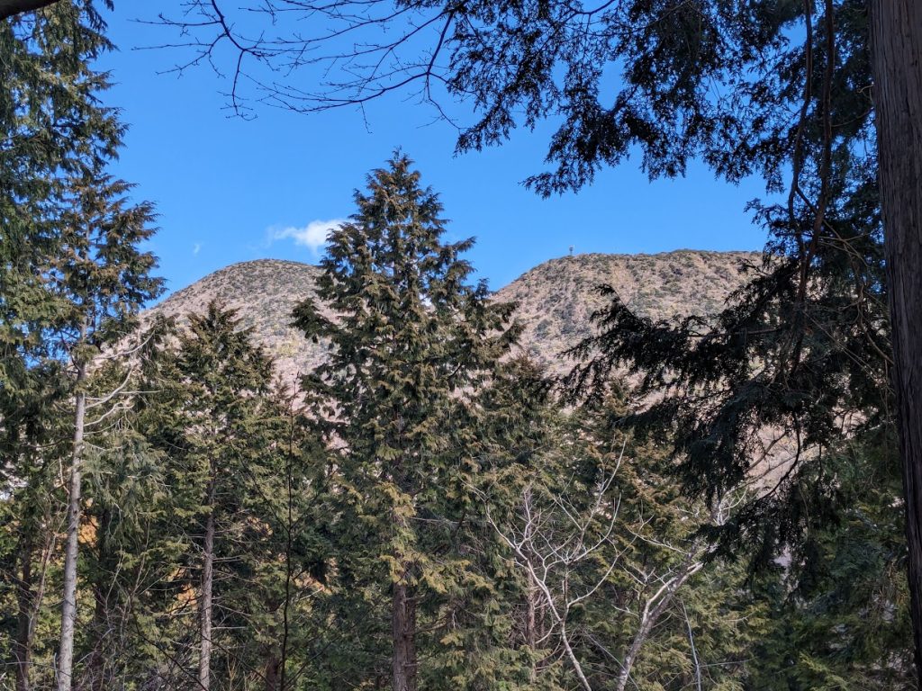 もう少し西へ進み広角で写真を撮る。今度は「駒ヶ岳」が写った。山頂にロープウエーの駅が見える。その左が「神山」だ。