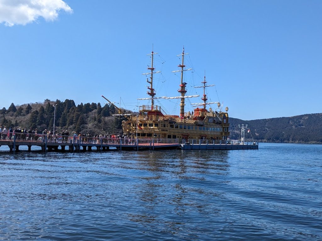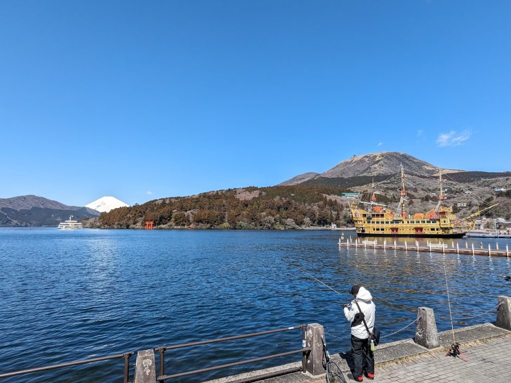 目の前に「芦ノ湖」が広がった。「箱根神社」の「第一鳥居」の前に出たのだ。すぐ前が「元箱根港」で「海賊船」の船着き場だ。わぁっ、スゴイ人だ! 旧街道を歩いていると気がつかないのだが、こんなに多くの人が箱根に押し寄せているのだ。人をかき分け、芦ノ湖の定番写真を撮る。「箱根神社の鳥居」「富士山」「遊覧船」のセットだ。この船は箱根遊船の「SORAKAZE」で、小田急箱根グループの「箱根海賊船」とは別物だ。