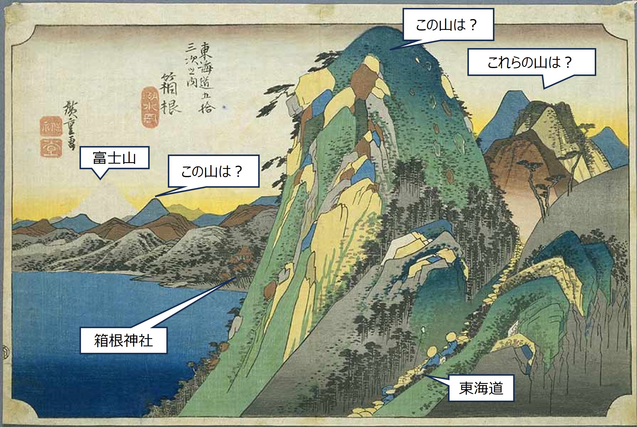 ここで問題である。冒頭の安藤広重の「箱根 湖水図」だが、正面の高く聳え立つ山はどこの山だろう? また、その右側にはそれに続く山並みが同じ精巧なタッチで描かれており、その向こうにも聳える山々がグレーで描かれている。これらの山々はどの山だろう? さらに、視線を左に移すと、画面左端に冠雪した富士山が描かれている。その手前にはグレーの山並みがあり、右側の山は高い。これはどの山だろう?