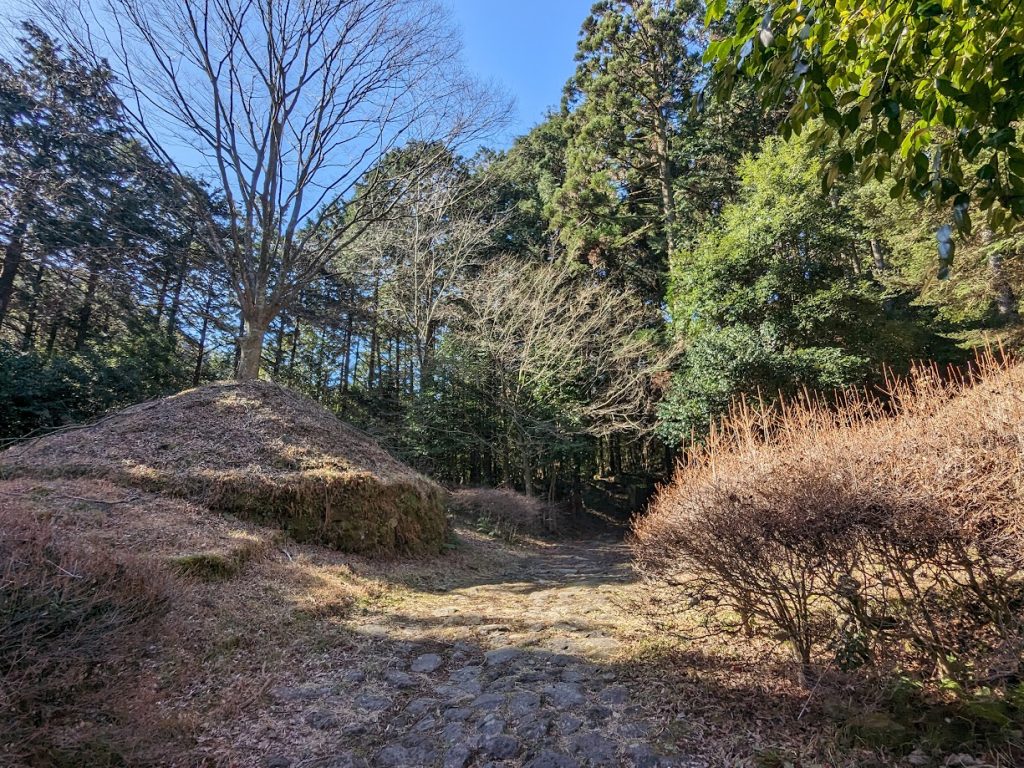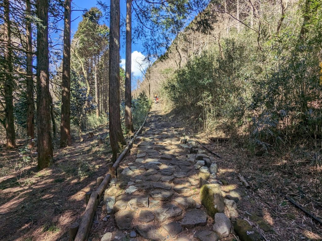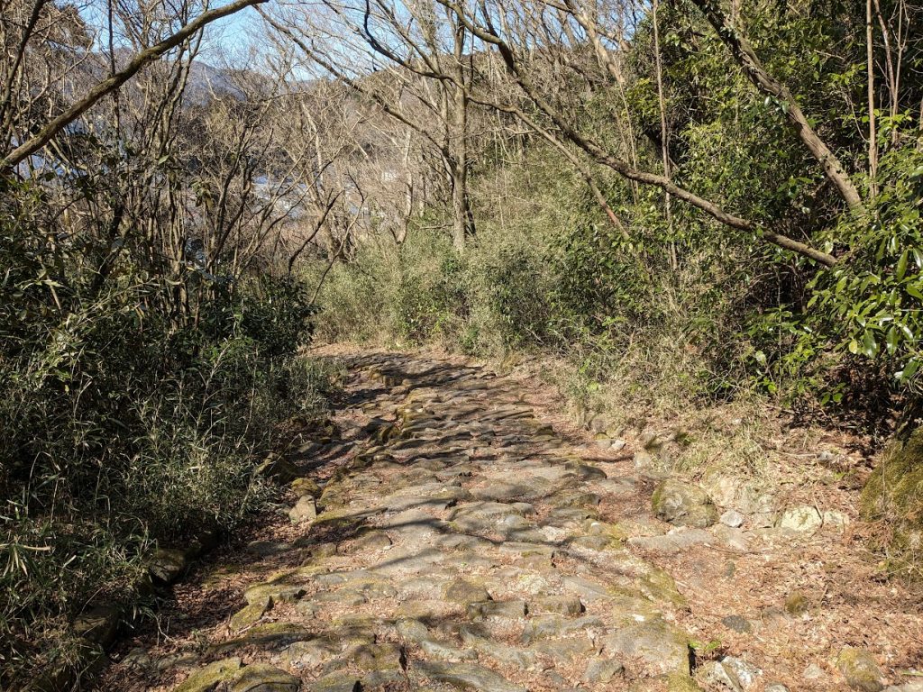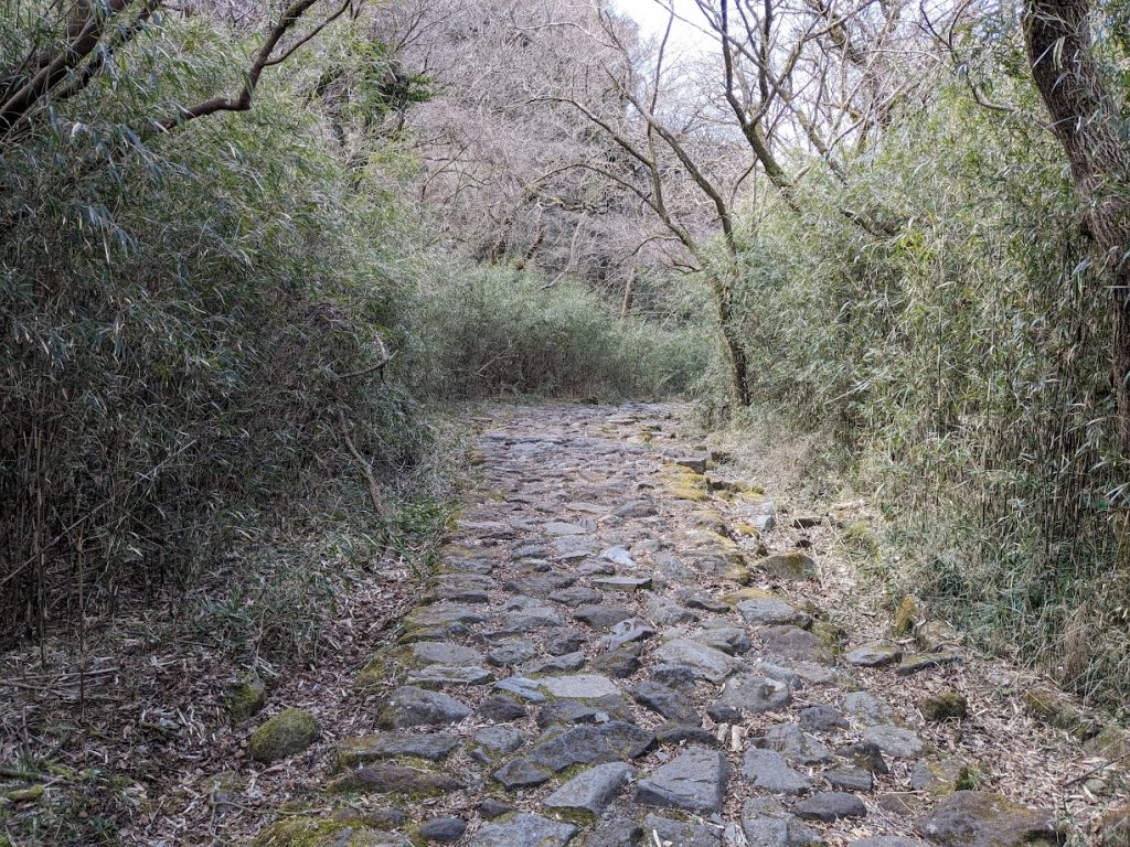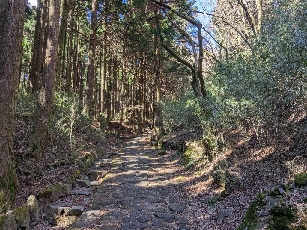 再び「県道 732 号」を横切るとまた「石畳の道」が続く。木々の間から「二子山」が見えた。ということは、「下二子山」の裾を過ぎたということだ。下り坂になってきた。箱根越えもいよいよ終盤に近い。だが、「石畳の道」は下りの方が歩きにくい。