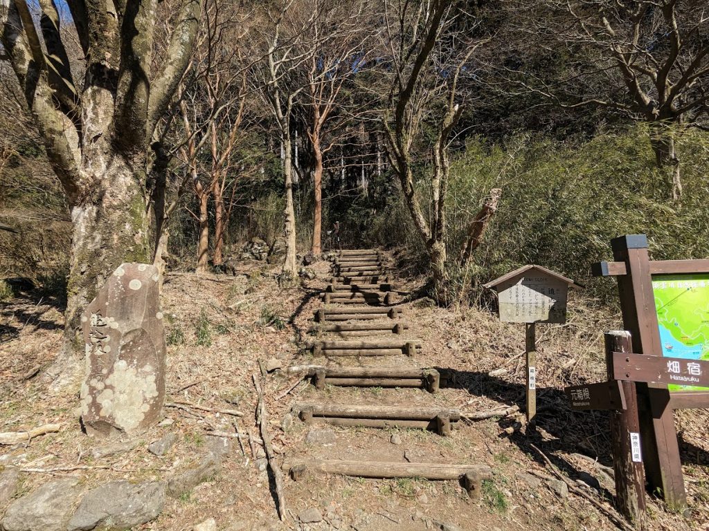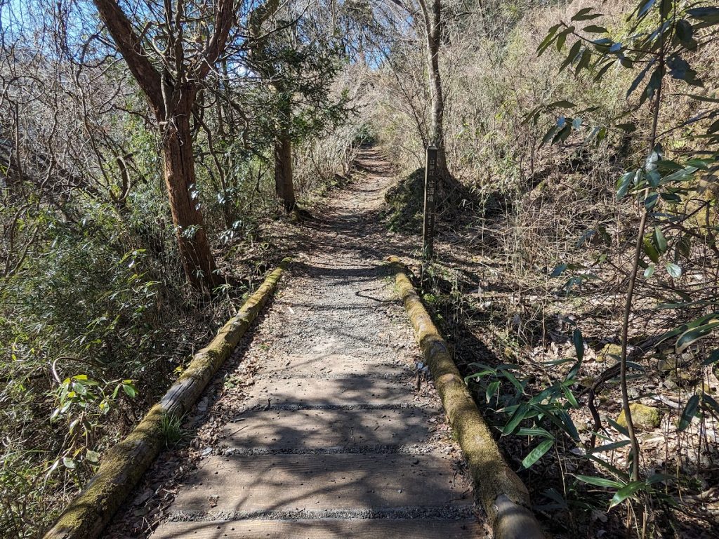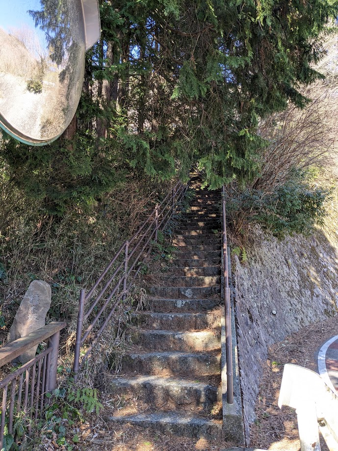 再び県道に出た。停留所の標識が立っている。「猿すべり坂」だ。今度は道路の向こう側に階段が見えている。あそこを上るのだ。