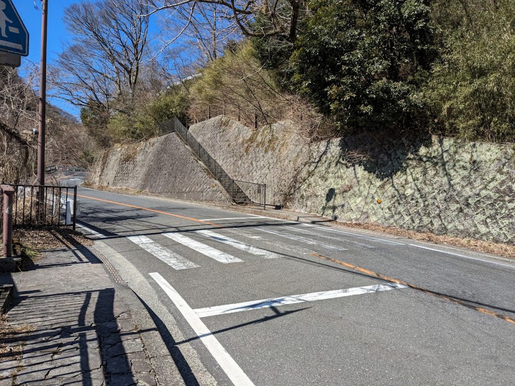 図 2 に歩いたコースを青線で示した。「国道 1 号線(箱根新道を含む)」が赤線、「県道 732 号線」が黄色の線である。「箱根新道」にかかる橋を越えた後、旧街道は「県道 732 号」に行く手を阻まれてしまった。このあたりが「西海子坂(さかいちざか)」になる。旧街道が新しく造られた道路に阻まれるのはよくあることだ。その場合、道路を渡った向こう側に道が続いているのだけれど、ここは先にも県道が見える。急坂なので七曲がりになっているのだ。仕方がないので「県道 732 号」を上る。途中、「箱根新道」のヘアピンカーブも加わって、複雑な道路になった。ヘアピンで蛇行しているが、なかなか急で息が上がる。
