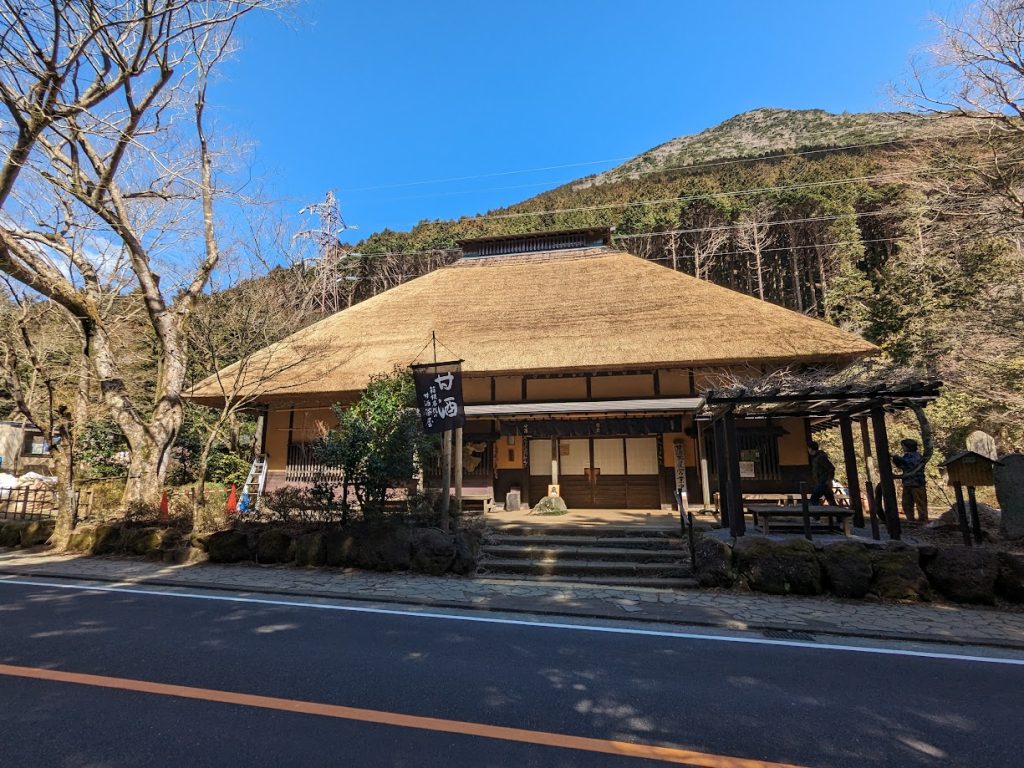 わずか 5 分で「甘酒茶屋」の裏に出た。県道側が正面のようだ。なかなか立派な茅葺き屋根の民家である。引き戸を開けてビックリ! 薄暗く、さらに煙っていて中が見えないのだ。しばらくして眼が馴れてくると、人が一杯いるのが分かった。奥に座敷があり囲炉裏がこしらえてある。霞んでいるのはこのいろりの煙のせいだ。土間には大木を輪切りにしたテーブルが置かれ、その周りに丸太の椅子が並べられている。左側のテーブルは中国系の男性たちで満席。中央のテーブルは西洋系の親子連れが坐っている。入口左が調理場になっていて、そこで注文するようだ。なんといっても甘酒だろうと、500 円を支払って注文。さて、どこに坐ろうか? 空いている家族連れのところで、May I sit down here? と断って坐らせてもらう? ここまで上ってきたので、かなり喉が渇いている。熱いお茶を一杯飲んで落ち着いてから、前の家族にどこから来たのかと訊いてみる。ハワイから来たとのこと。「だから、とても寒くて」と奥さんが答える。旦那さんは寡黙だ。男の子と女の子はひたすら力餅を食べている。「ここ、とてもインターナショナルですね」と私。正直な感想だ。「そうそう」と奥さん。そこに注文した甘酒がやってくる。うまい! とても上品な甘さだ。「東海道を歩いているんですよ」と私はちょっと自慢げに説明した。「何日目ですか?」と旦那さんが始めて口を開いた。「1 月に日本橋を出て 6 日目です」と私。そう、まだ 6 日しか過ぎていないのだ。「雨やら雪やらでなかなか箱根越えができなくて、3 月になってしまいました」と説明を加えた。甘酒を飲み終わり、ふきのとうの醤油漬けを買って、私は店を離れた。店の人から、このあたりでは本来の旧街道は県道だが、車が通るので裏のハイキング道を進むのがよいと教えて貰った。