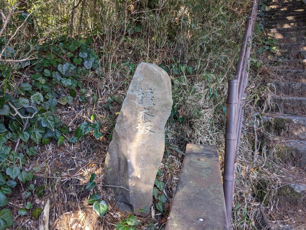 なるほど! 「橿木坂 登り五町許(ばかり)」の石碑があり、その横に階段がついている。この先が「橿木坂」なのだ。果たして「どんぐりほどの涙」がこぼれるか?