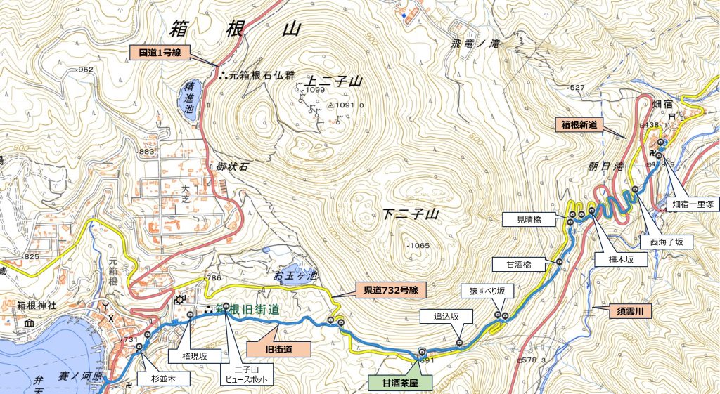 図 2 に歩いたコースを青線で示した。「国道 1 号線(箱根新道を含む)」が赤線、「県道 732 号線」が黄色の線である。「箱根新道」にかかる橋を越えた後、旧街道は「県道 732 号」に行く手を阻まれてしまった。このあたりが「西海子坂(さかいちざか)」になる。旧街道が新しく造られた道路に阻まれるのはよくあることだ。その場合、道路を渡った向こう側に道が続いているのだけれど、ここは先にも県道が見える。急坂なので七曲がりになっているのだ。仕方がないので「県道 732 号」を上る。途中、「箱根新道」のヘアピンカーブも加わって、複雑な道路になった。ヘアピンで蛇行しているが、なかなか急で息が上がる。