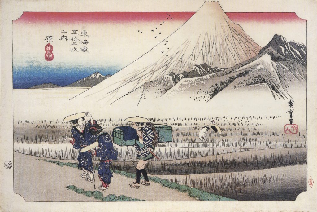 つまりこの道は砂州の上にあり、その内側には潟湖があった。この潟湖が「浮島湖」なのだ。海岸沿いの道に典型的な風景である。図 1 は広重の『東海道五十三次 原 朝之富士』であるが、北側は茫々たる荒れ野、その向こうに冠雪して真っ白になった「富士」がそびえ立つ。あまりの高さに、なんと枠をはみ出してしまっている。「富士」の手前の山は「愛鷹山」である。この位置関係をちょっと頭に入れておいてほしい。「富士山」の左裾はスッキリと伸びているが、右側は半分くらいまで「愛鷹山」で隠されているのである。
