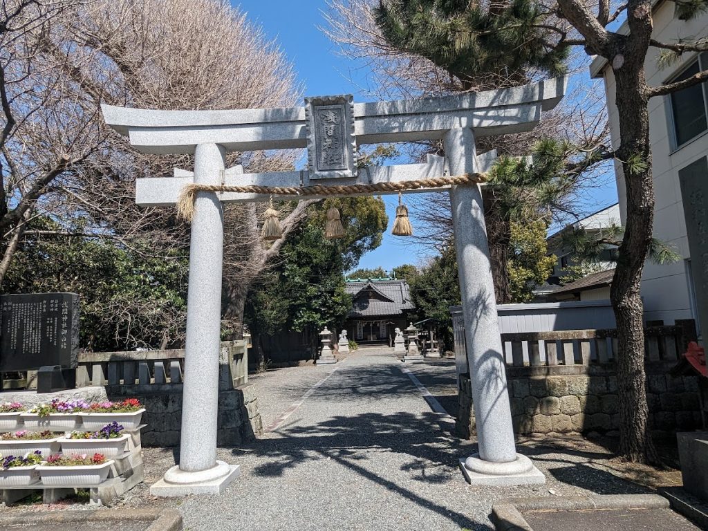 この道、つまり「旧東海道」を歩いている酔狂な人間はいないと思っていたのだが、今日は土曜日とあってお仲間がいるようだ。発見したのは「女忍者軍団」四名。日焼けを避けるためか、黒装束なのだ。腕は勿論、顔の辺りも黒いマスクで覆われている。見るからに「くノ一」! 年の頃は、そんな恰好なので不明だが、かなり若いと見た。道路の左側の家屋の階段のところに坐って休憩中だったところを発見した。「旧東海道」なかなか休憩するところがないのである。まだ 3 月だというのに、今日は太陽が燦々と照りつけ、とても暑い。日陰で休憩する場所が欲しい。休憩中だと分かったのは、揃って腰を上げるところだったからだ。みんなリュックを背負っている。前を通り過ぎると、彼女たちも歩行を開始した。すぐ後についてくる。女性軍に追いかけられるのは変な気持ちだ。右側に神社を見つけたので、そちらに移動。