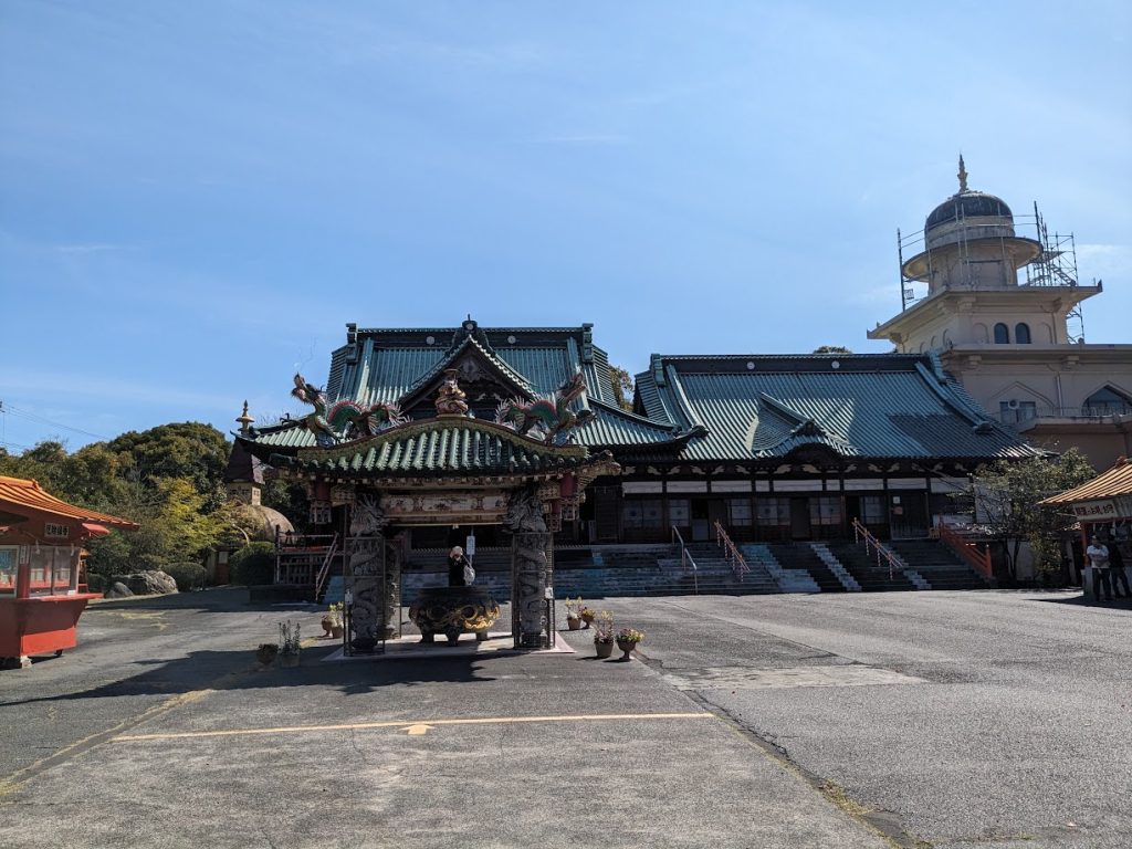 この香炉堂はなんだ! 極彩色の中国風の建築物である。その奥にあるのは純和風の建築物、これが本殿。千木や鰹木はないが神社風だ。それに前にあるのは狛犬ではないか! この右にあるインド風の塔を持つ建物は「錬成道場」となっている。
