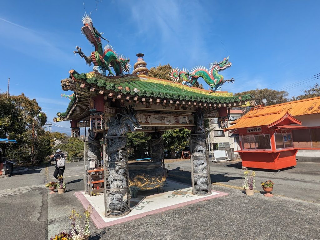 お寺のホームページを見ると、「今を去る千年余、山伏たちが寺裏の田子の浦海岸で水ごりを取り、海抜ゼロメートルから富士山に登った、 その禊ぎの道場が当山の起こりです。三万八千坪の寺領は戦国時代に武田氏の東海道進出の砦となり、又これを受けて徳川頼宣公 (徳川家康側室お万様の御長子即ち徳川御三家紀州公)が長く駐留されたこともあいまって 「出世本懐の地」と呼ばれています。主神毘沙門天像は聖徳太子の御親作と伝わり「太子両肩上湧現の尊像」と言って聖徳太子の肩の上に立たれた像で 実に珍しい様式です。普通の像が悪鬼をふんまえているのに対し、この像は聖徳太子すなわち我々人間の上に毘沙門天王が立って常に 護ってくださるという開運の「守護神像」であります」と書かれている。『東海道名所図会』にも「香久山妙法寺という日蓮宗の寺あり。また毘沙門堂なり。この尊像は聖徳太子の御作にして、長八尺、肩上に聖徳王の尊像立ちたまふ」とある。古くからあるお寺であるが、最初からこの日中印の複合的な建築だったかはわからない。