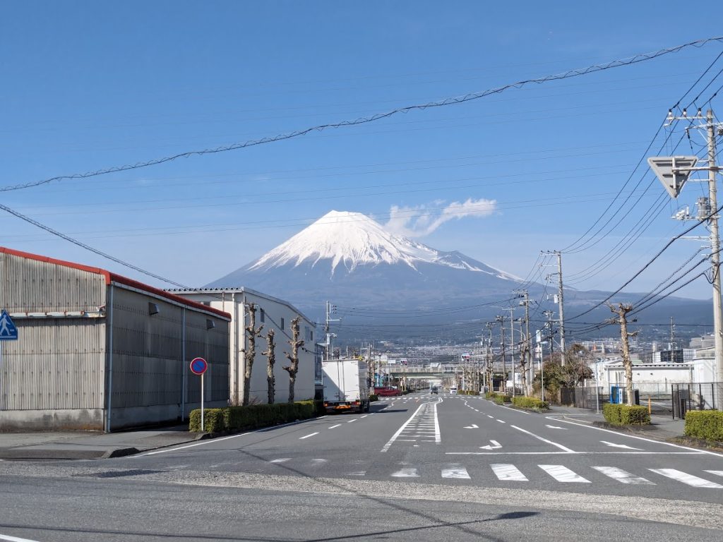 次第に「東海道本線」が近づいてきて「旧東海道」と交差する。踏切を越えた先で「富士市」に入る。その後、道は「県道 380 号線(千本街道)」と合流する。直線道路の先に「女忍者軍団」を発見。右側にはずっと富士の山が見えている。