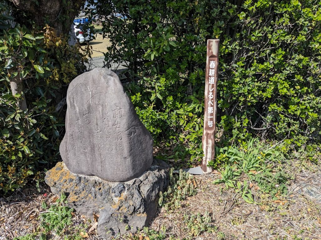 Google Maps で「須津」を調べると、「岳南鉄道」の駅がある。ここから北へ約 4 km のところである。「吉永」は現在の「富士市比奈」で「須津駅」の北東すぐのところ。どうやらこの標識は北に伸びる道を示す道しるべのようだ。帰って調べると、「春耕」というのは明治時代に「吉永村」に住んでいた「仁藤春耕」さんのこと。「旧東海道」から「吉永村」を通って、十里木(裾野市)、印野、須走(ともに御殿場市)を経て山中湖に至る道に五年がかりで石の道しるべを建てたとのこと。「自分の歩幅で距離を測っては石を探し、のみとつちを使ってたった一人で 128 基の道しるべを作って設置した」(富士市資料)らしい。日清・日露戦争に召集されなかったので、自らもなにか役立ちたいと思ったのがその理由。その記念すべき第 1 号がこの道しるべなのである。