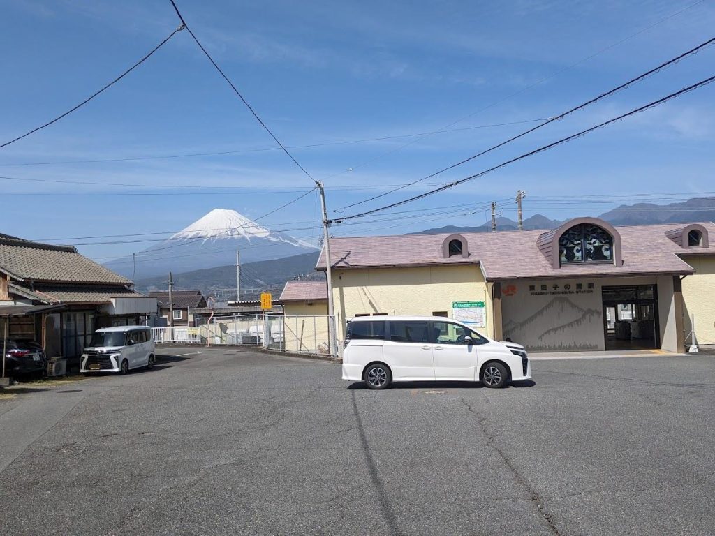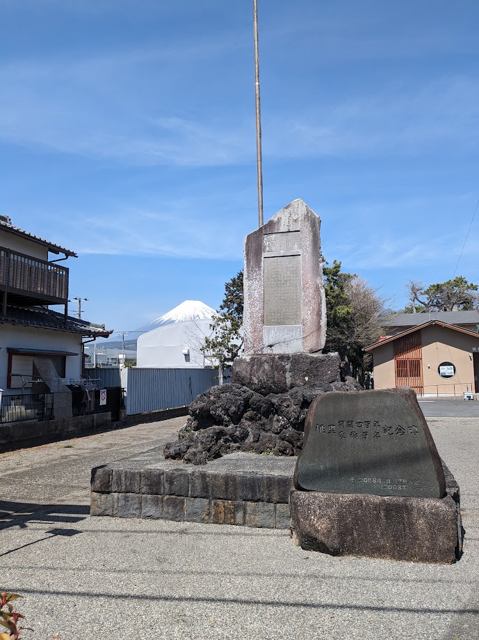 駅があった。「東田子の浦」だ。ここで「女忍者軍団」に追いついた。「さあ富士山だ」といきたいのだが、障害物が多くていい写真にならない。駅の壁に「富士山」と「愛鷹山」が描かれていたが、だいぶ実際と違う。この絵、かなり広重の影響を受けている。駅前に「東田子の浦駅 開駅 70 周年」の碑が建てられていた。