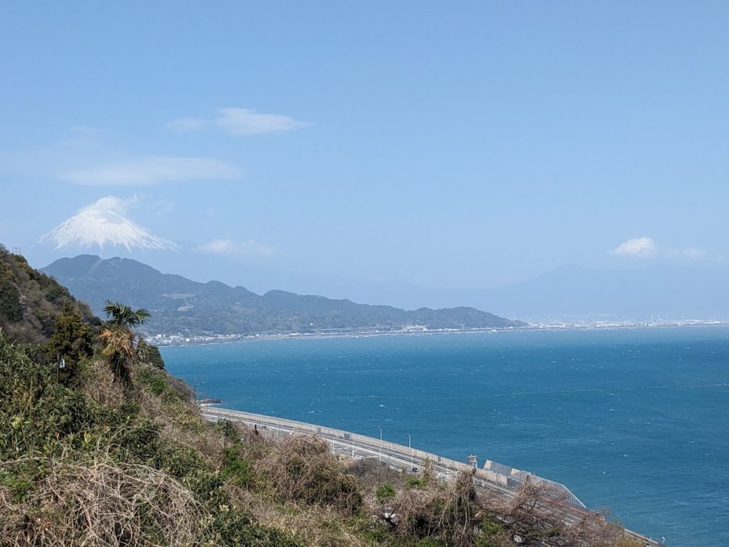 この先、山道を登っていくと左側に休憩所があったのでちょっと一休み。桜の木があるが残念ながらまだつぼみのだ。振り返ると「富士」が見える。「蒲原」の北の山々が遮っているので、さらに綺麗な「富士」を見ようと思えばもっと高みに上がる必要がある。右側にうっすら見えているのは「愛鷹山」だろう。
